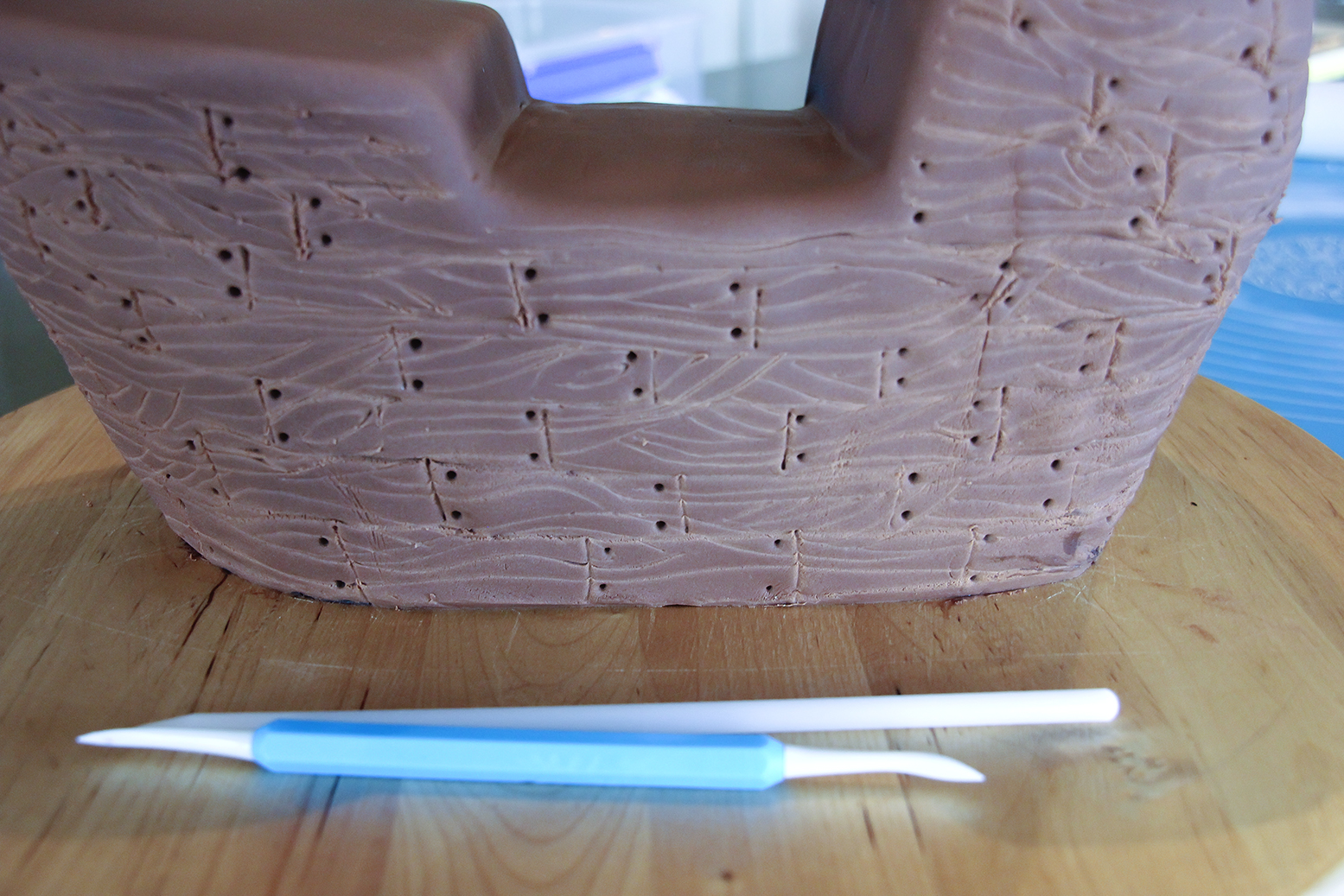 Roll out some of the left over brown sugar paste into a long thin sausage shape and cut 22 pillars of equal length. use fingers to make each one as cylindrical as possible and stick to ship with a little water, edible glue or egg white.