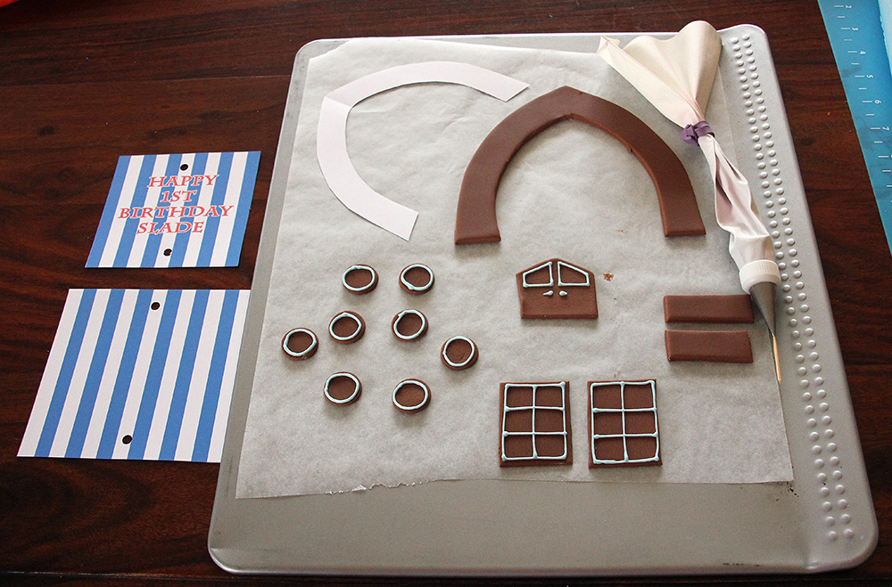 Cut out some port holes, windows, doors and handrails. Use a piping bag to pipe some pale blue Royal Icing around the windows etc. to add interest. Leave overnight to firm up.